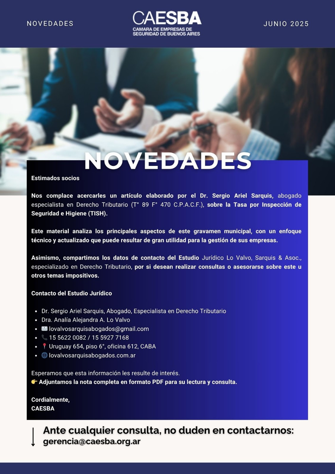 ¡Tenemos una gran noticia! Nos complace compartir que hemos escrito un artículo para los socios de CAESBA (Cámara de Empresas de Seguridad de Buenos Aires) sobre Tasa por Inspección de Seguridad e Higiene. Una oportunidad para aportar nuestra mirada profesional y seguir construyendo juntos conocimiento y valor en el sector.